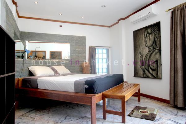Master bedroom: king-size bed, aircon, en-suite bathroom with hot shower, sliding doors to the pool.